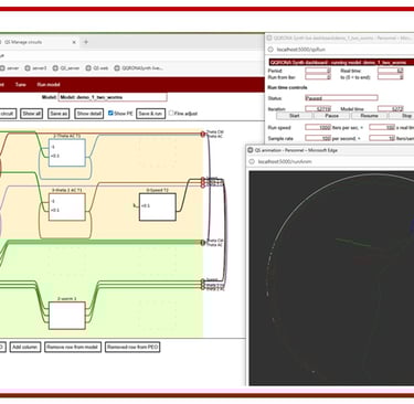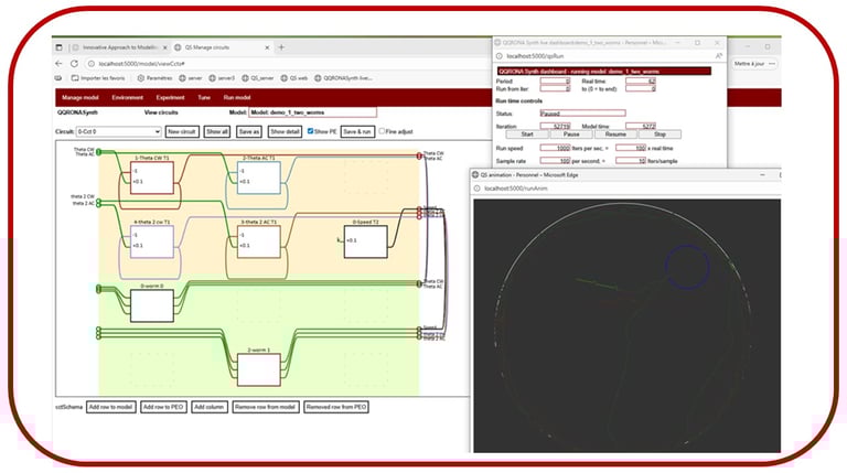 Notez que les modèles présentés, ne composés que d’une poignée de Qcells, visent à illustrer les possibilités de QQRONA, et non à présenter un modèle réaliste du sujet. Si vous travaillez avec C. elegans, E. coli ou tout autre élément naturel à modéliser, et que vous souhaitez utiliser QQRONA pour créer des représentations plus réalistes de leurs comportements, veuillez nous contacter.
