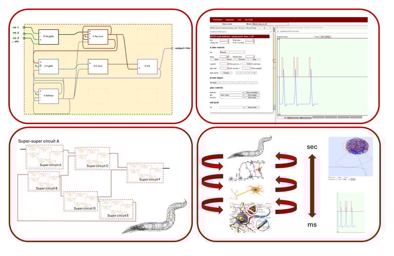 A simple QQRONA model simulates the characteristic behaviour of a neuron producing an action potential. The video also explores how this simple model is used as the building block for creating more complex neural models, up to the scale of a full organism.